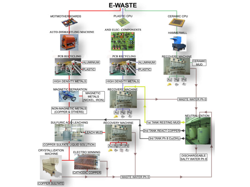 The main body of e-waste is shredded and crushed. Magnetic separators, eddy current separators, and electrostatic systems separate metals from non-metals. - Precious Metal Extraction