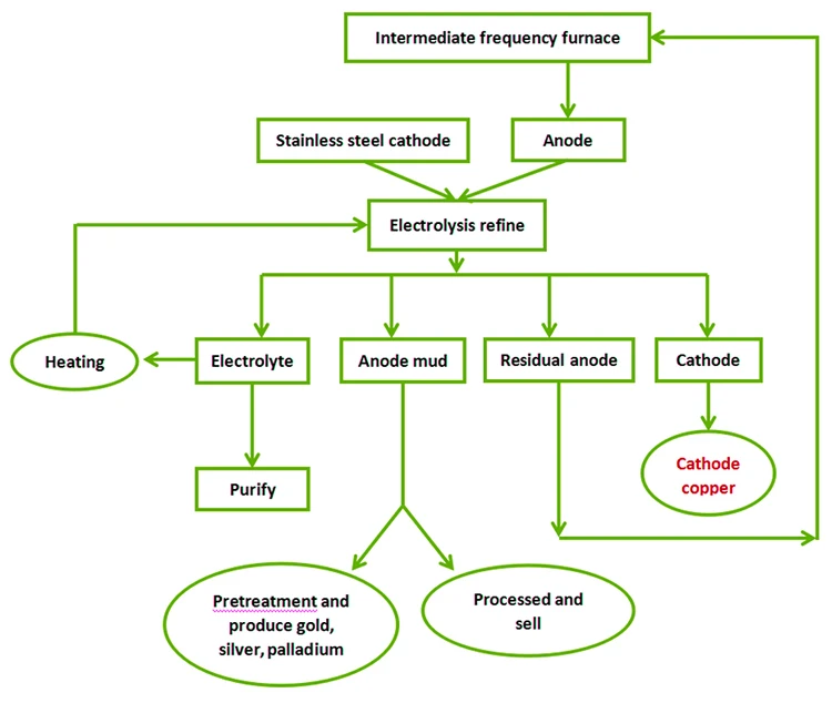 The refining anodes taken out from the refining furnace is changed into electrolytic copper with purity of 99.99% through an electrolysis process: Duringelectrolysis, copper (II) ions leave the impure copper anode and since they are positive, migratingto the negative cathode. From time to time, the pure copper is scraped off the cathode. Impurities from the copper anode, such asgold, silver, platinum and tin, collect at the bottom of the electrolyte solution, deposited as anode slime.