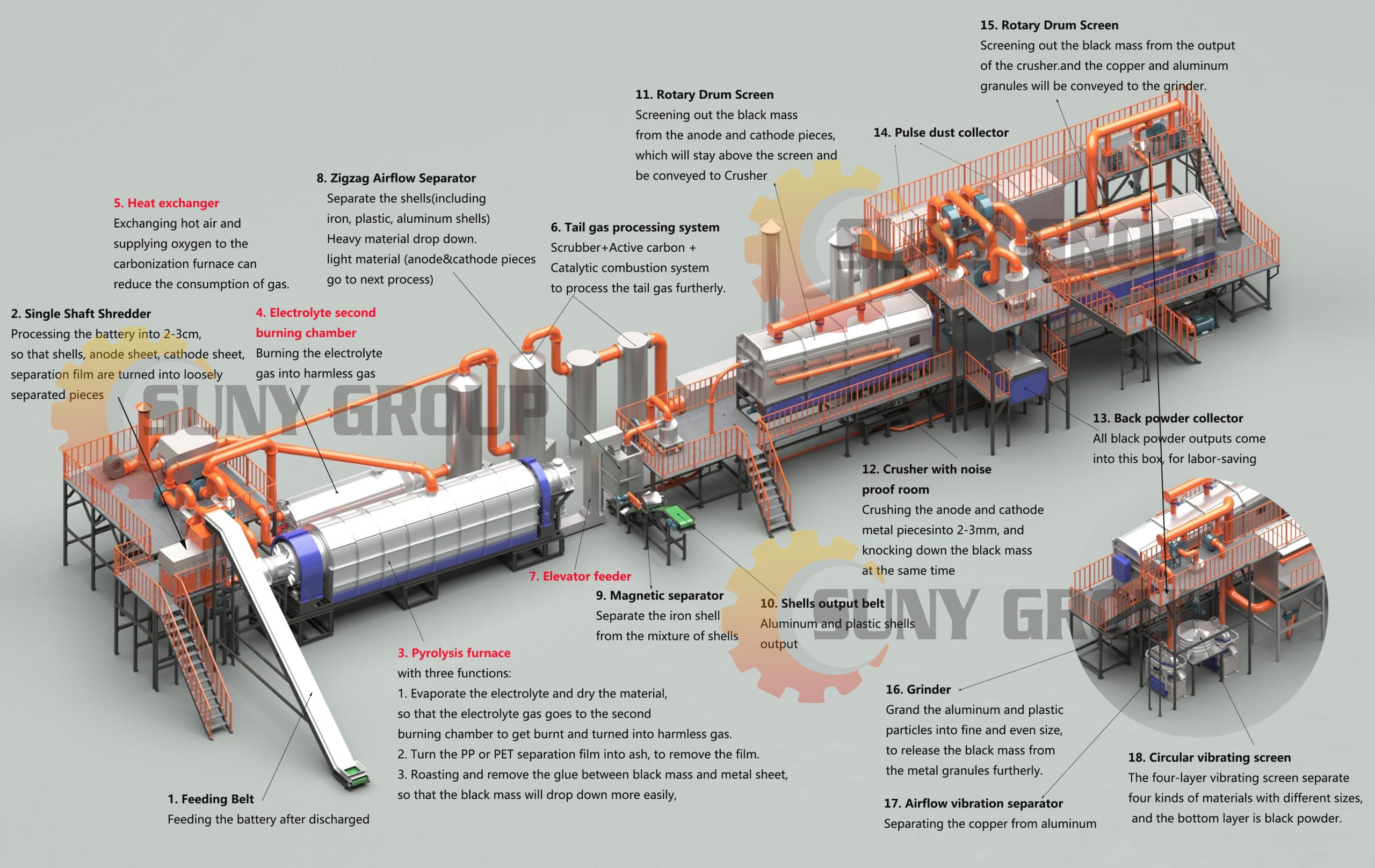 Modern lithium-ion recycling plants are equipped with advanced dust collection and exhaust gas treatment systems to ensure compliance with environmental regulations. Automation and intelligent control systems improve operational efficiency, reduce labor costs, and enhance safety.