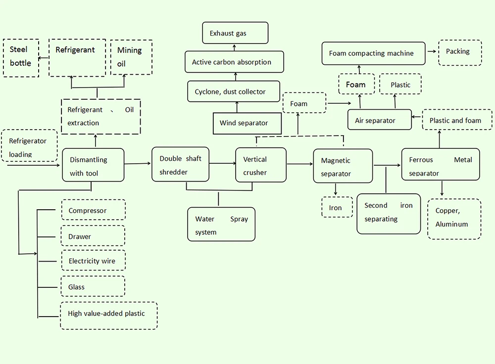 In the working process, waste refrigerators are first fed into the system and undergo safe pretreatment, including degassing and component removal to ensure compliant handling. The units are then shredded into uniform pieces by a heavy-duty shredder. Advanced magnetic separation, eddy current separation, and air separation systems are used to sort different materials accurately. Foam insulation is efficiently separated and collected, while dust and emissions are controlled through a dedicated filtration system.